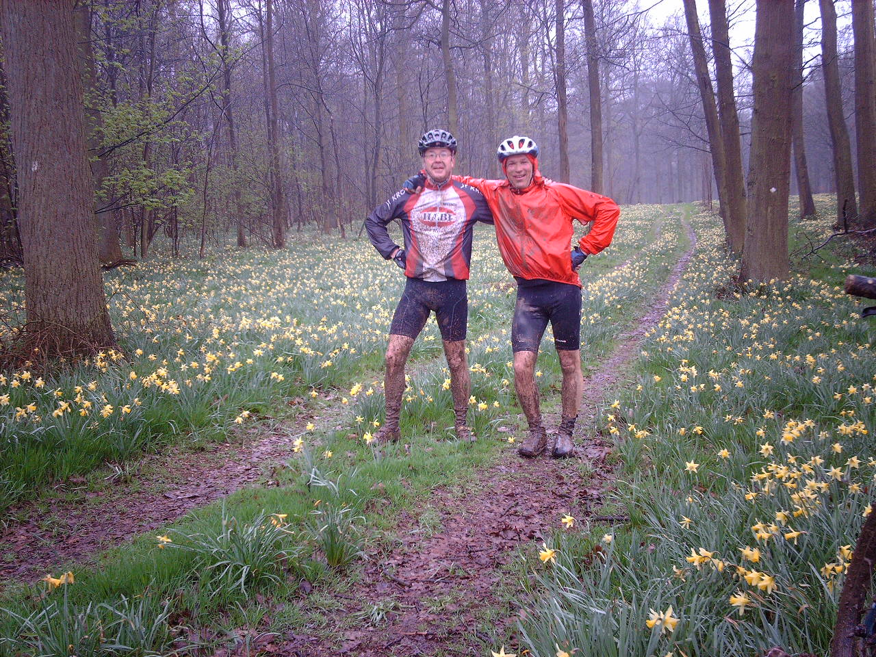 Oh là là. Un peu moins de 10°C, de la pluie fine après une semaine bien humide = un tour gras, gras, gras pour deux gars qui en voulaient. Stefan et Fabian. Stefan, pour son premier tour de l’année, pas encore au top de sa forme vélo, a donné beaucoup. Jusqu’à arriver au bois de Buis, ou là, l’enfer ! A côté des tapis de jonquilles, des VTTistes couchés que Stefan évitait à petite vitesse. La fin a été pénible, nous avions froid et étions fatigué. Il fallait y être ! A défaut de douche, le lac de Grand-Leez a permis un décrassage mérité. Les excuses ont été nombreuses : Dom et Philippe rentrés à 6h (déjà imbibés d’eau – ferrigineuse – avant d’y être), Fred rentré trop tard (?), Pierre C qui se retape de sa chute de la semaine passée, Pierre qui joue avec les grands !